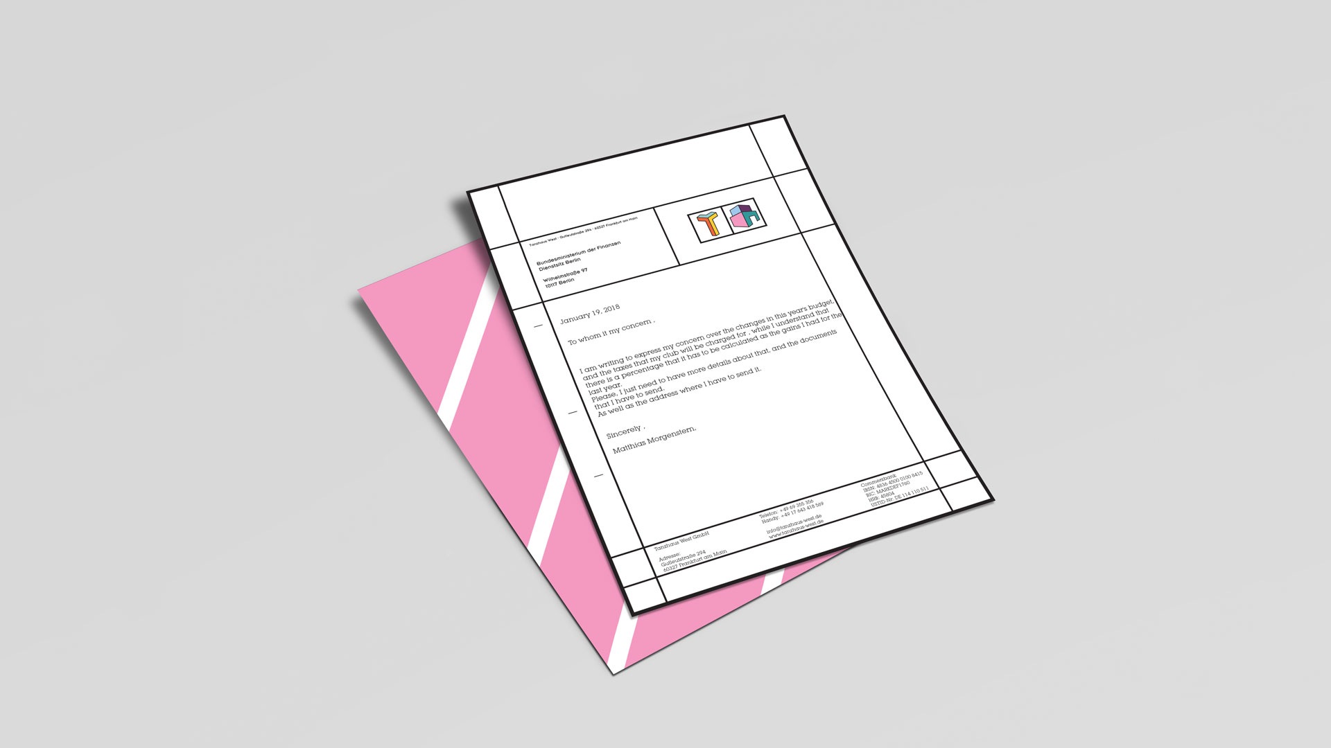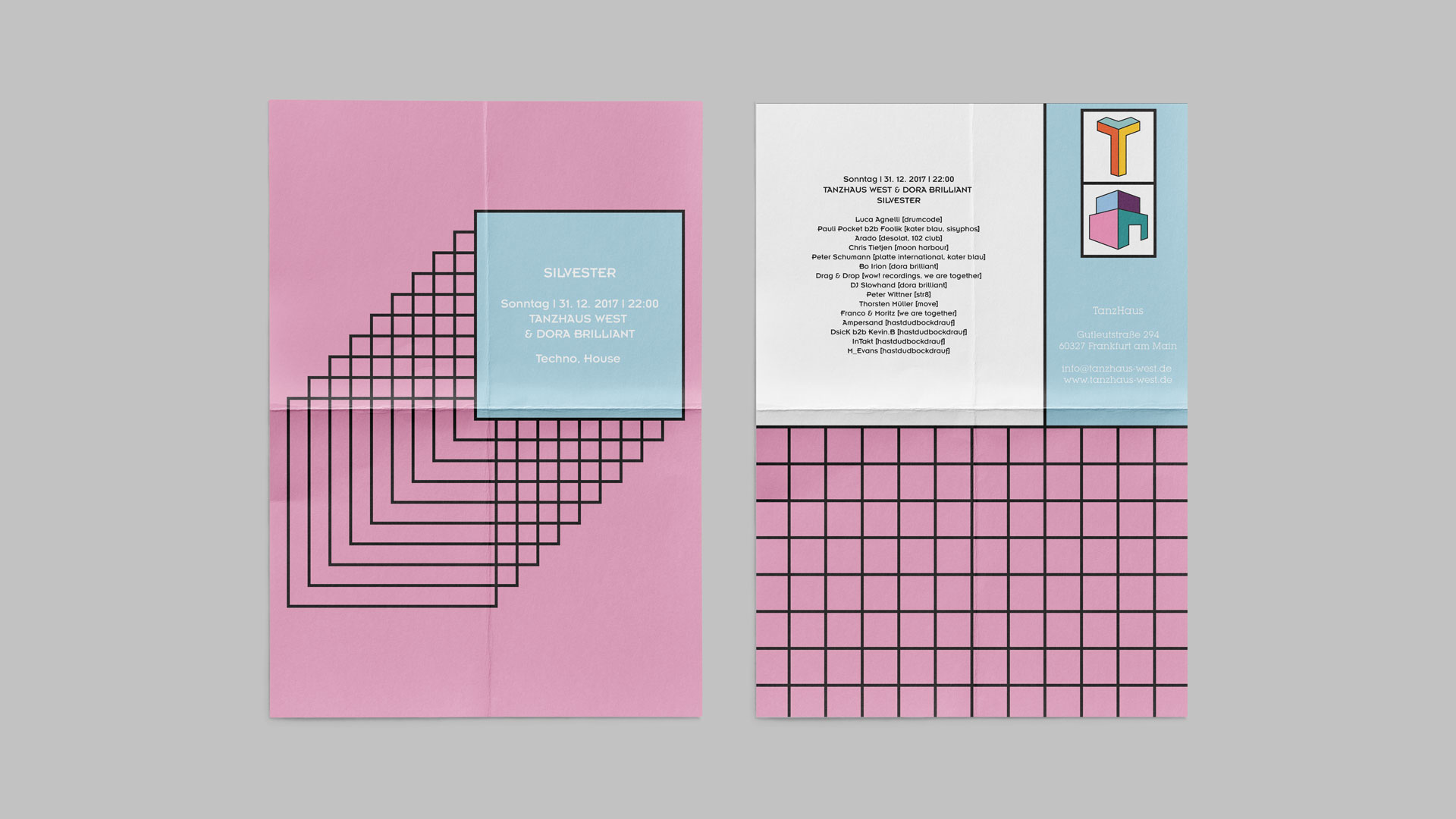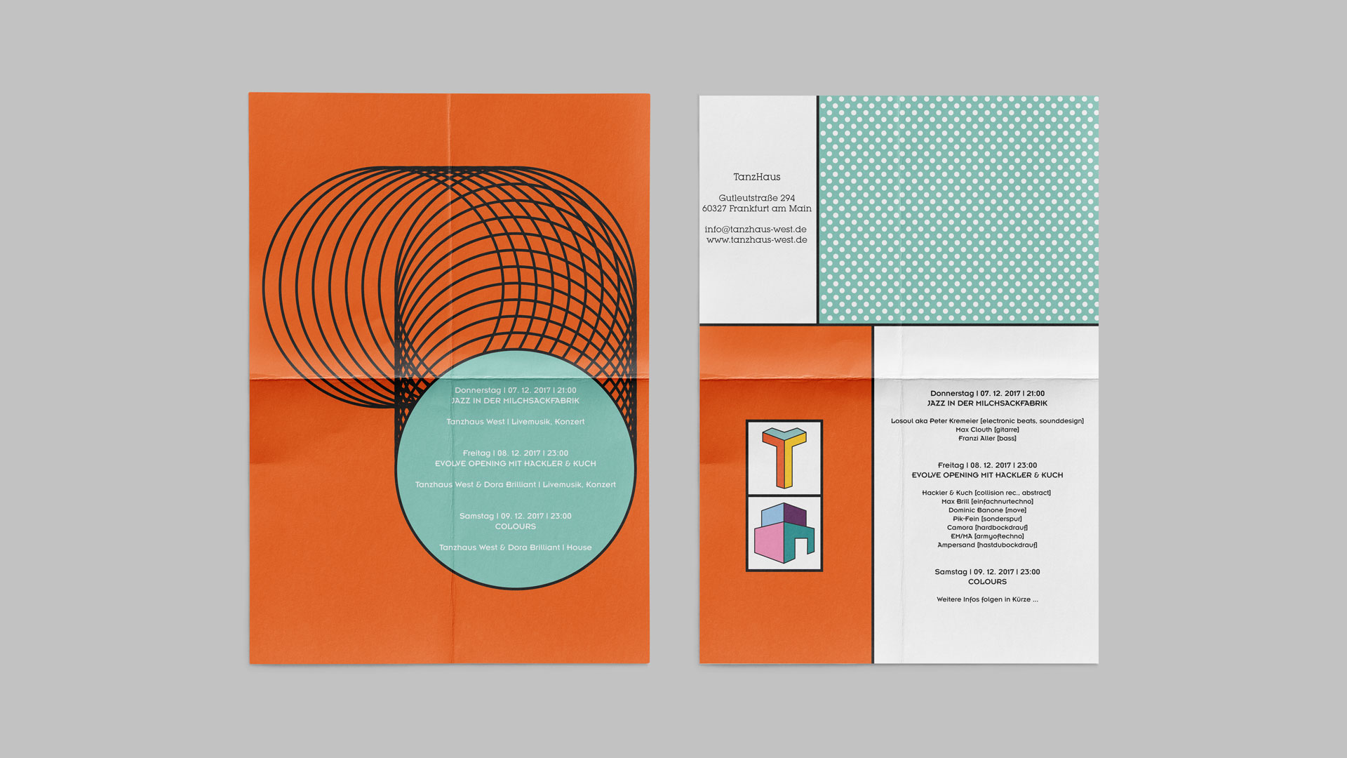 So, first of all, I created the logo inspired by the letter “T” and the shape of a simple house, which is “T” from the word “Tanzhaus” and house.Otherwise, the colours used, are the colours of the mixers of the DJ’s, which is between sharp and light. I used geometric shapes, for the brochure, the poster, etc … For the design, I used the spaces to give an impression about inside the club.