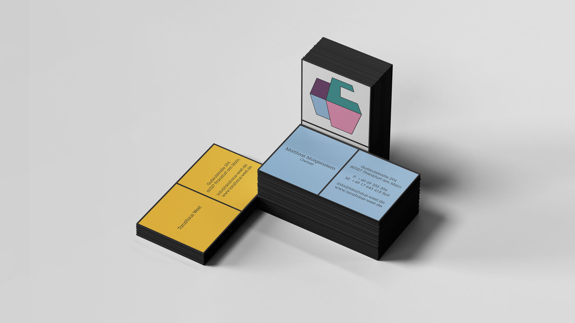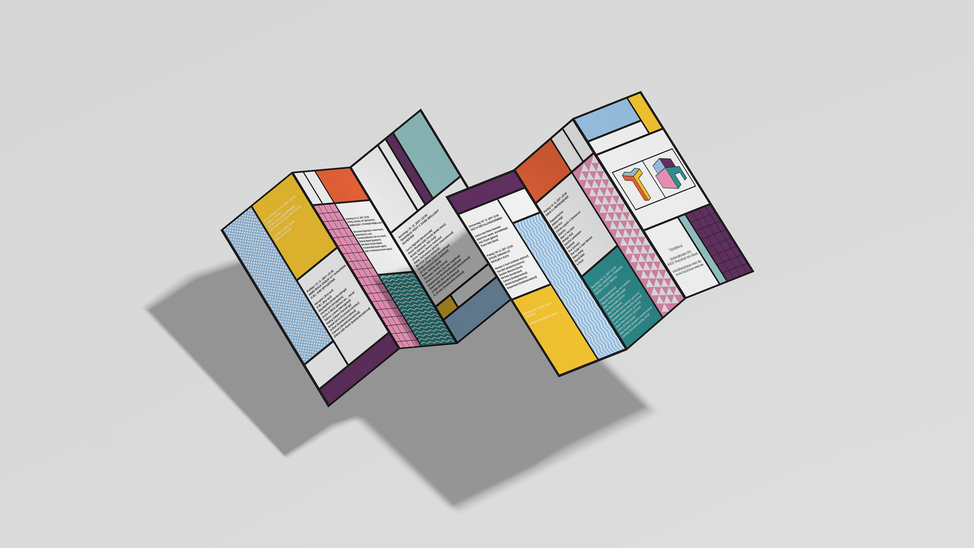 So, first of all, I created the logo inspired by the letter “T” and the shape of a simple house, which is “T” from the word “Tanzhaus” and house.Otherwise, the colours used, are the colours of the mixers of the DJ’s, which is between sharp and light. I used geometric shapes, for the brochure, the poster, etc … For the design, I used the spaces to give an impression about inside the club.